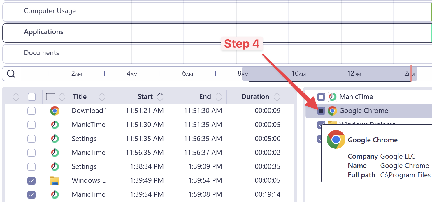 Below the timelines, you’ll find Details and Summary grids that list applications and activities. You can select time here using checkboxes.