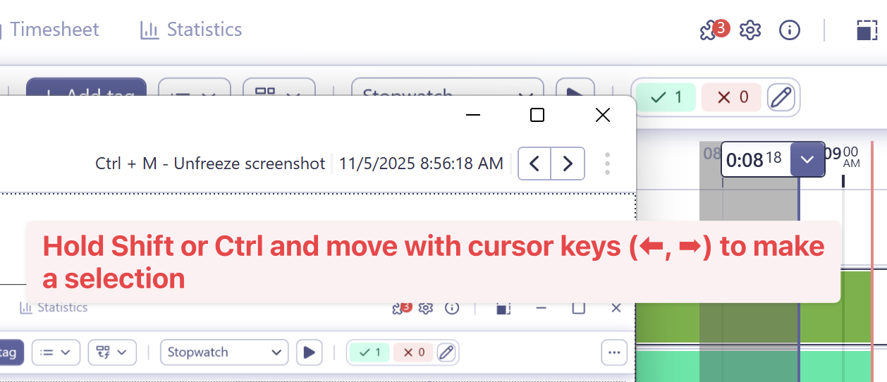 - Drag to select: Click and drag over the timeline to highlight a time range. While dragging, you can move across different timelines - the cursor will snap to the end of activities underneath, keeping your selection accurate and easy to control. If you drag over the time timeline, time will snap to full minutes.