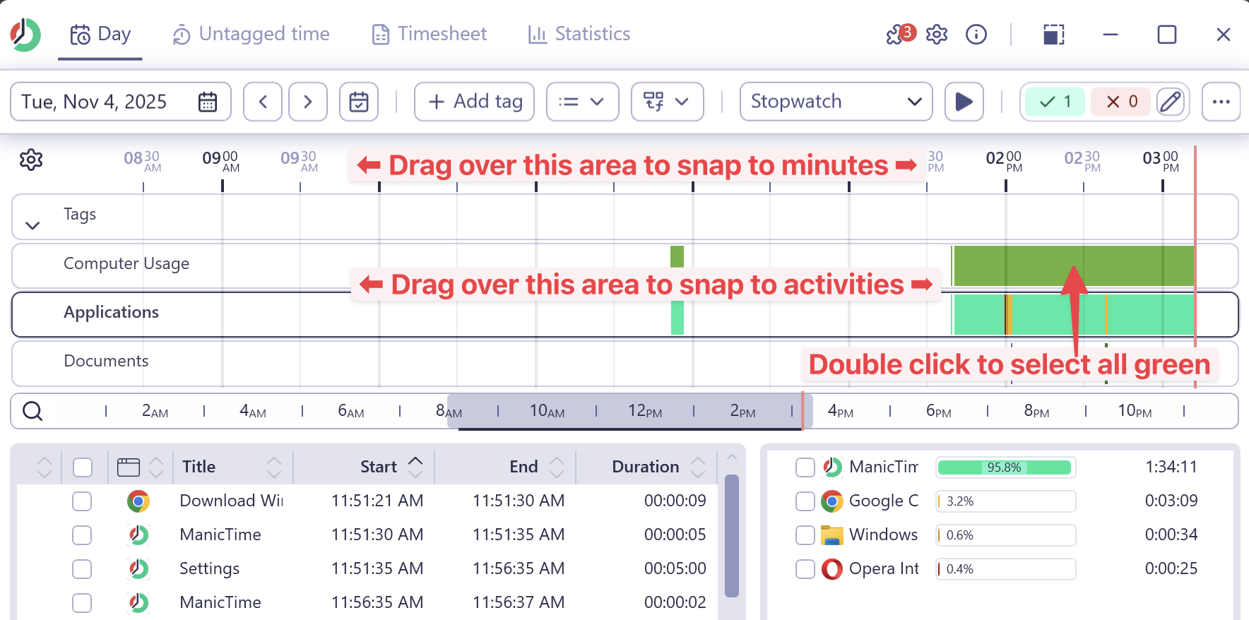 - Double-click to select: Double-click on any tracked activity (for example, "Active Computer Usage") to select that entire time block.
