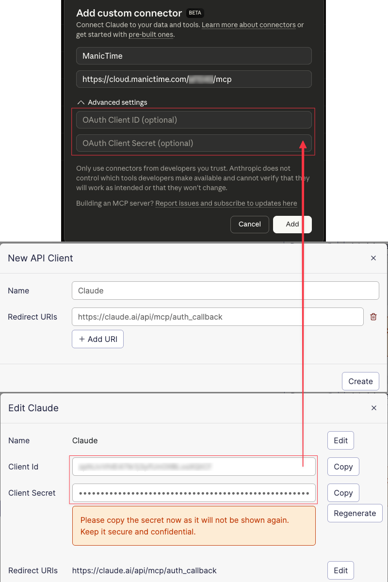 - For callback URL use: https://claude.ai/api/mcp/auth_callback (unlike ChatGPT, Claude does not display the callback URL automatically, so you need to enter it manually)